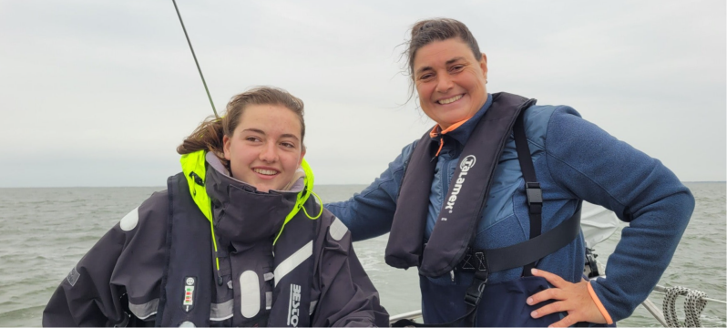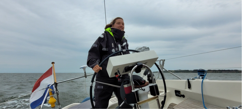 Voor ons vaart een Deen die dezelfde route schijnt te varen. Dat is makkelijk met zo'n extra punt om op te focussen. We moeten wat eilanden omzeilen. Myrthe stuurt voor het eerst bij windkracht 5 Bft. Lekker bezig!