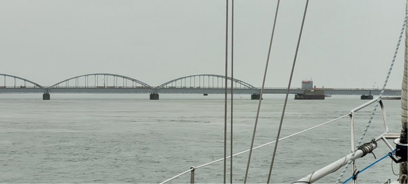 Precies om kwart voor zes dalen de slagbomen en gaat de brug draaien. Myrthe kan haar ogen niet meer open houden en zij gaat binnen liggen. Wij varen ondertussen verder. Het weer wordt slechter en slechter. De kant is niet meer te zien. De regen komt met bakken uit de hemel. We wachten een aantal pieken af en gaan als het wat minder wordt de fenders ophangen en de lijnen aanslaan. Wij zijn klaar voor het invaren van de haven.