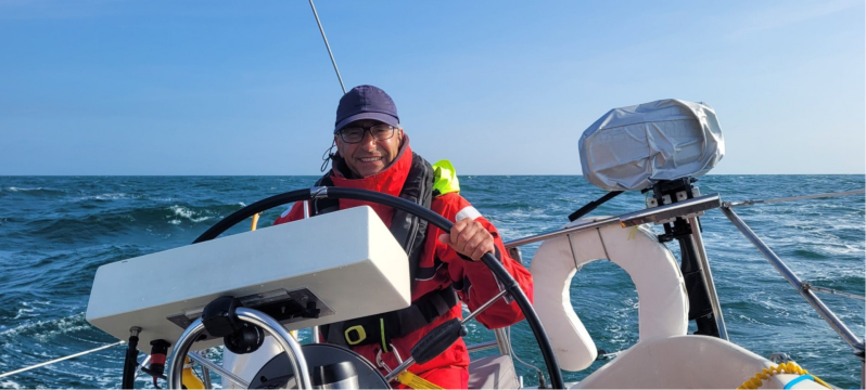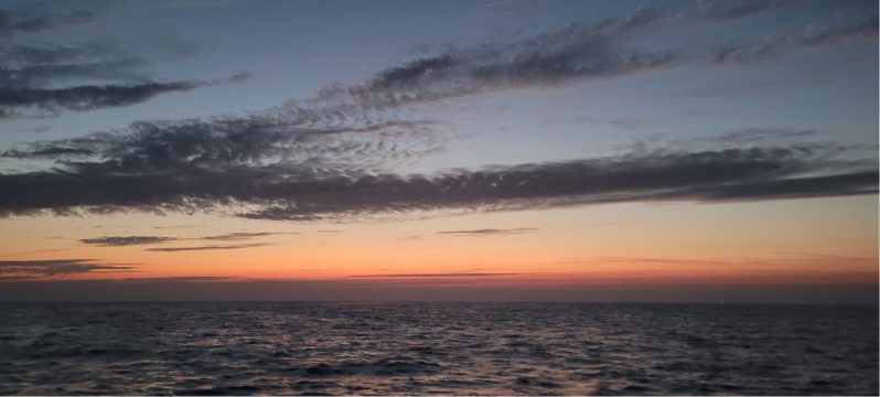 Paul Michèl neemt het weer over tot zonsopkomst en Renata neemt het stokje om half zeven weer over. Eindelijk varen we in een gebied met niets om ons heen en geen scheepvaart. Even wat rust! Renata geniet van het opkomende zonnetje. Langzaam droogt de boot en ook haar zeilpak weer op. Deze waren vannacht behoorlijk nat geworden.