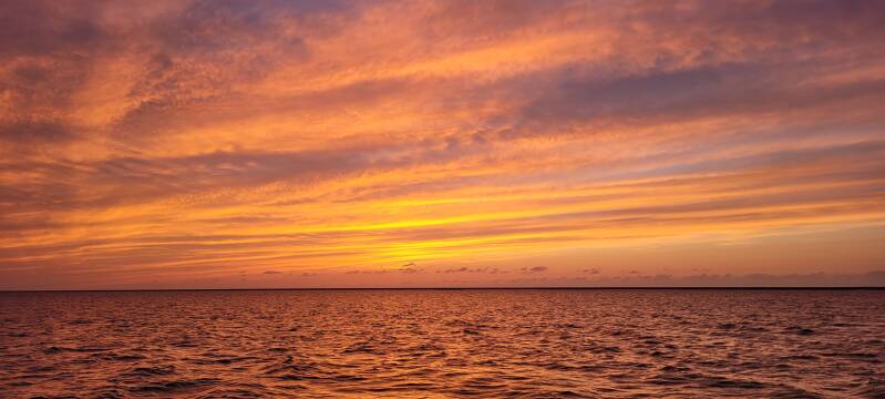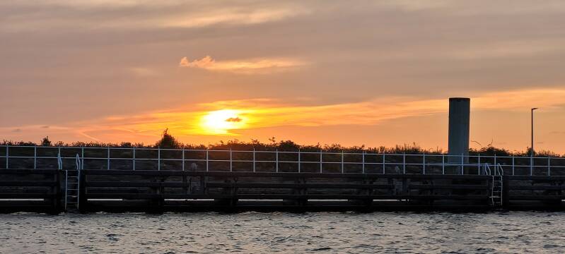 Het is tijd voor de warme maaltijd. Paul Michèl had al wraps voorbereid en dat is nu dus een kwestie van prutje en tortilla warm maken en opdienen. We proberen het nog extra gezellig te maken in de kuip met kaarslicht erbij, maar de waxinelichtjes waaien uit voordat het glaasje goed en wel staat. Dan maar in het donker eten. Gezellig is het toch wel. De lucht met de ondergaande zon is werkelijk prachtig, zij kleurt oranje en paars!