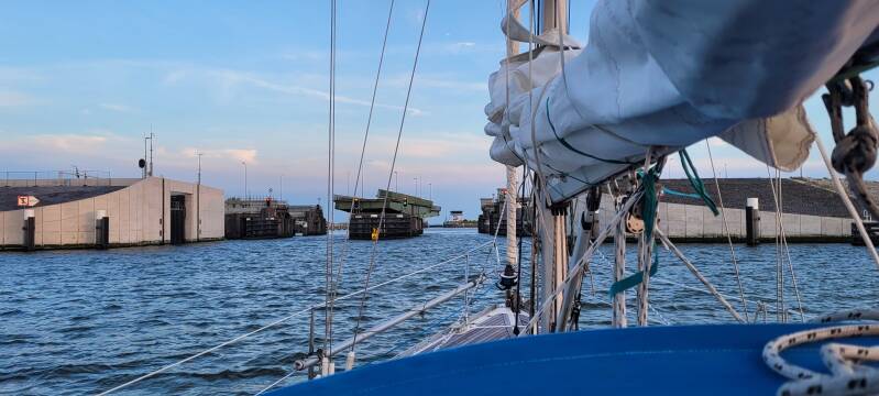 Om 20.00u naderen we de brug en sluis bij Kornwerderzand. We nemen contact op met de sluiswachter en hebben weer mazzel. De brug gaat vrijwel meteen draaien en de sluis staat al voor ons open. Voor we het weten varen we het zoete water van het IJsselmeer op.