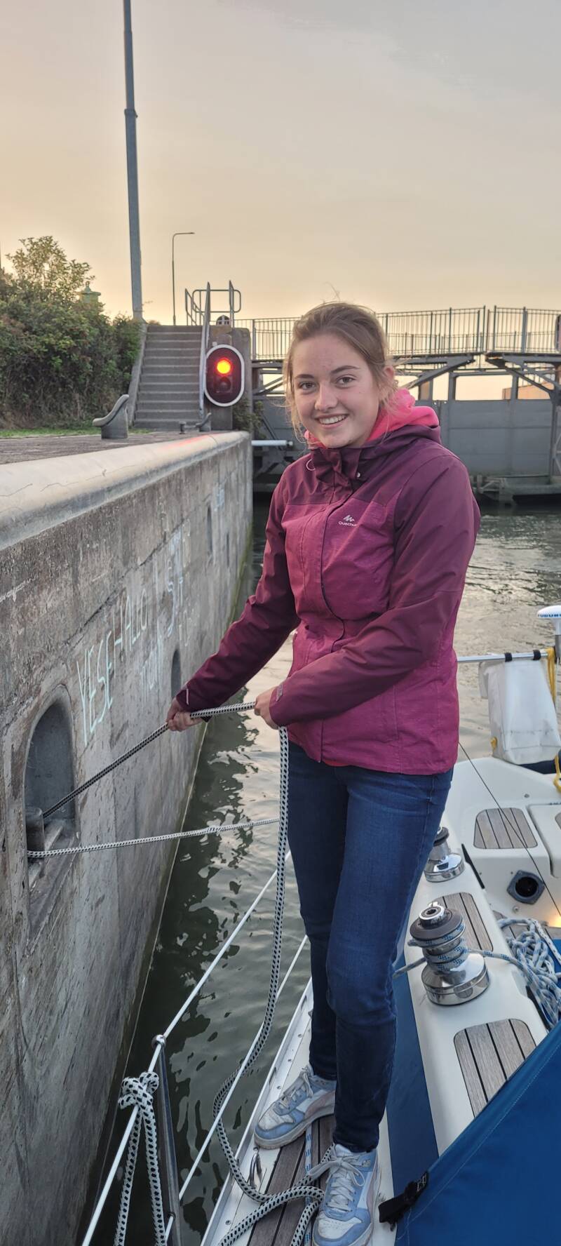 Als Renata de wacht overneemt, zijn er nog maar twee die ontweken moeten worden. Daarna kunnen we in een rechte streep op de hoek van de dijk afvaren. Daar maakt Renata Paul Michèl weer wakker en doen we samen het laatste stukje. In de kom net na Flevomarina strijken we de zeilen. Renata vaart de boot tussen de haven hoofden door en maakt zich dan klaar om aan te meren in onze box. Gelukkig is de boot van onze buurman goed herkenbaar, want anders was moeilijk te zien welke box het precies is.