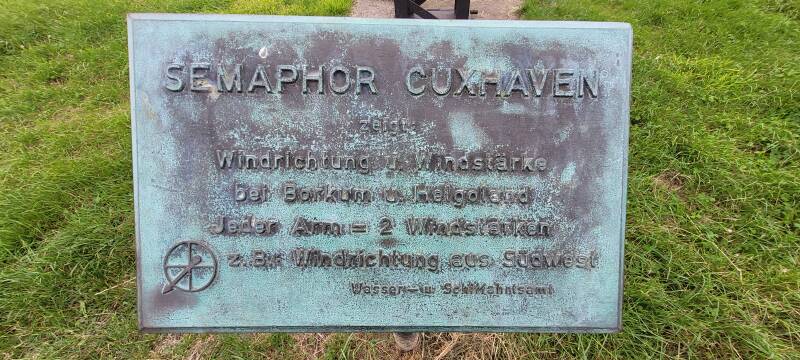 We lopen verder naar de Semaphor. De Semaphor stamt uit 1884. De naam komt uit het Grieks en betekent "tekendrager". De Semaphor gaf de windsnelheid en -richting aan passerende schepen aan nabij de eilanden Borkum (B) en Helgoland (H). De windsnelheid- en -richtingindicator wordt nog steeds dagelijks aangepast aan de actuele weersvoorspelling. De pijlen geven de windrichting aan, terwijl de signaalarmen op de mast de windsnelheid aangeven. In 1903 woedde er zo'n zware storm dat de Semaphor omver waaide. Een jaar later was de Semaphor weer in gebruik en heeft sindsdien talloze stormen en twee wereldoorlogen doorstaan.