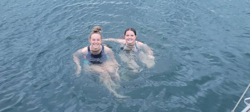 Na het eten en afwassen gaan de meiden met z'n drieën nog even zwemmen in de haven. Daarna is het lekker onbeperkt douchen en naar bed.