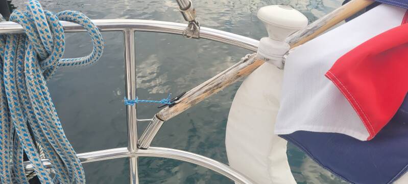 Na het ontbijt halen we eerst het bijbootje aan boord. We zien een houten zeilbootje vertrekken uit de haven. Het bootje heeft geen motor en helpt zichzelf trekkend aan de meerpalen de haven uit. Wij hebben wel een heel donkerbruin vermoeden hoe onze vlaggenstok afgebroken is. Onze boot steekt namelijk buiten de meerpalen en het enige wat dan makkelijk voor het grijpen ligt, is onze vlaggenstok...