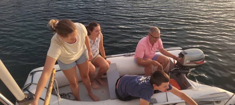 Na het eten gaan de kinderen de afwas doen en gaan Paul Michèl en Renata samen oefenen met het bijbootje te water laten. Dat gaat soepel. Paul Michèl verplaatst de beugel van de buitenboordmotor, iets meer naar het midden van de kuip, zodat hij niet zover hoeft te reiken als hij de buitenboordmotor moet pakken om aan het bijbootje te hangen. We doen een rondje net buiten de haven, waar een Nederlands schip voor anker ligt. Als Maxim klaar is met water bijvullen, gaat hij samen met Renata nog een rondje door de haven.