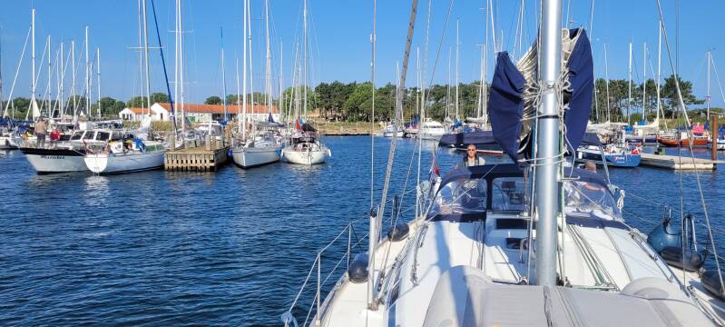 Bij de zuidpunt moeten we even hoog aan de wind opkruisen. We passeren een minuscuul windmolenpark dat bestaat uit een rijtje van 10 windmolens. Als we de zuidpunt gerond hebben, komt Ballen langzaam in zicht. Voor het laatste stukje zetten we nog even de motor bij. We zijn heel benieuwd hoe druk het in de Ballen Lystbådehavn zal zijn. De haven staat er om bekend om goed gevuld te zijn. Voor ons doen zijn we aan de vroege kant, dus we hebben hoop. Tegen tweeën ruimen we de zeilen op, hangen de fenders op en slaan de lijnen aan. Vervolgens draaien we het haventje in.