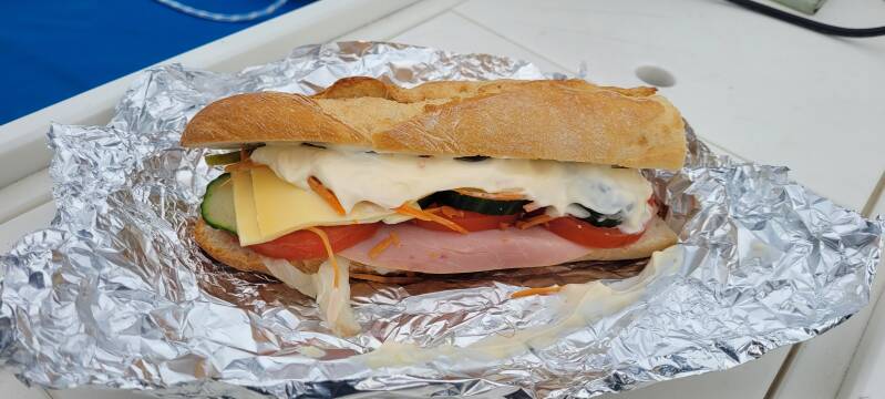 Na het eten is het tijd voor het klaarmaken van de broodjes gezond. We willen morgen op tijd weg en het zal weer een lange dag op het water worden. We willen in één keer doorvaren naar Rendsburg. Als de sluis in Holtenau een beetje meewerkt zal dat makkelijk moeten kunnen, maar drie jaar geleden hebben ze ons meer dan drie uur laten draaien voor de sluis in de bloedhitte, dus je weet maar nooit...