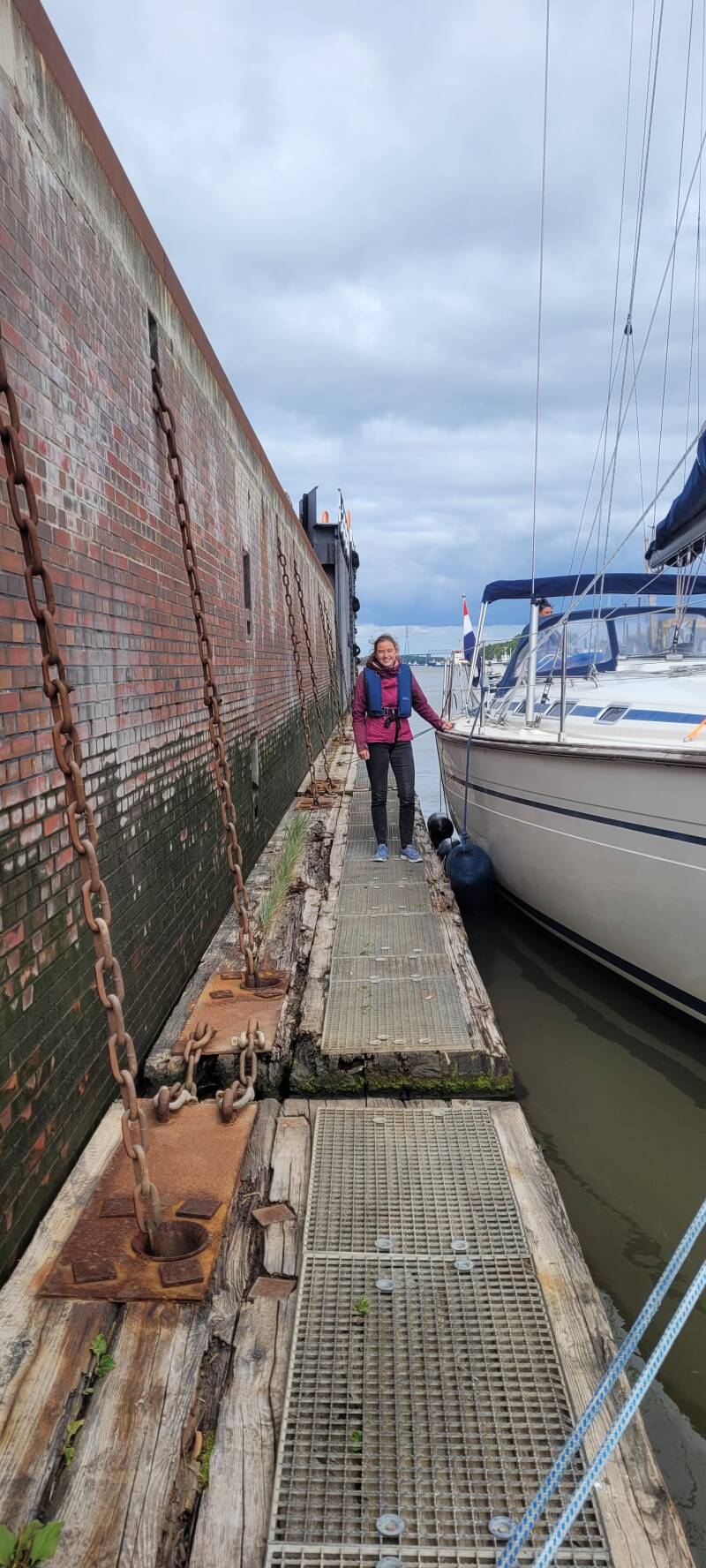 Al snel zien we de andere boten achter het vrachtschip de sluis in varen, dus wij sluiten snel aan. De fenders drijven al op de waterlijn. Het hekje is open, zodat we makkelijk van boord kunnen springen. Renata springt met de achterlijn van boord en Judith met de voorlijn. Zodra de achterlijn vast zit, mag de voorlijn dat ook. Het gaat als een geoliede machine. Vervolgens hebben we alle tijd om weer aan boord te klimmen. Voor Judith een makkie, voor Renata iets meer uitdaging.