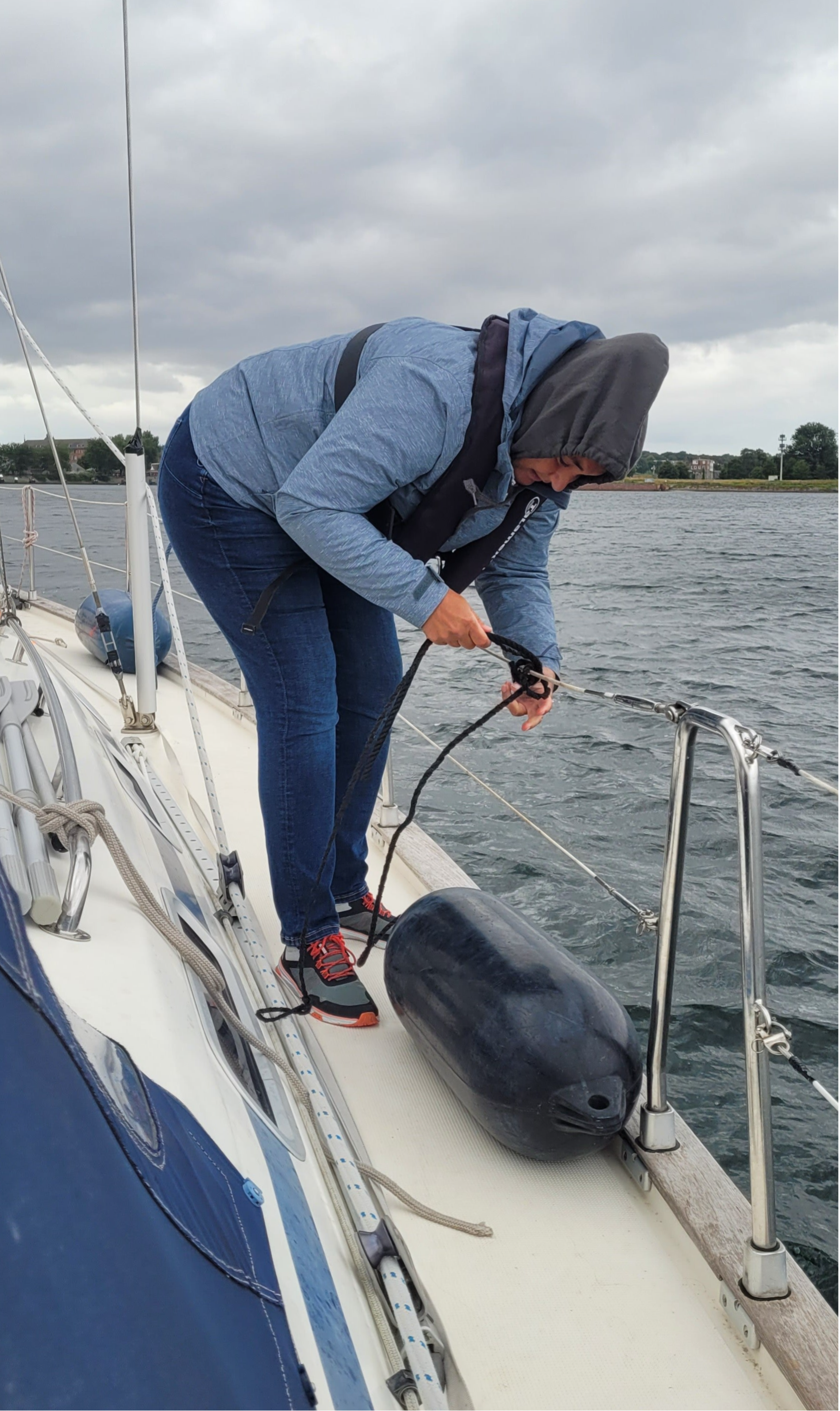 Renata en Judith gaan het gastenvlaggetje van Denemarken verwisselen voor die van Duitsland. Dat is even een oefening in het leggen van paalsteken, want we hebben nog niet de handige haakjes die we op Ohana Junior hadden gemaakt.