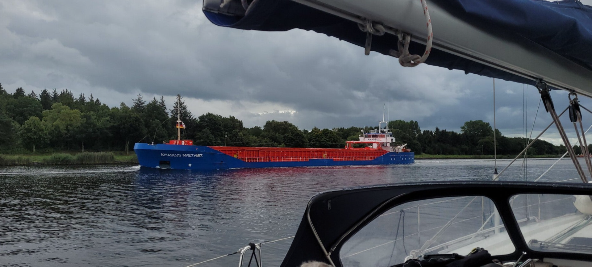 Jammer dat het ook af en toe spettert, dus we zetten de bimini op om een droog te zitten. Het waait ook echt hard hier op het kanaal. We tikken gewoon 34 Kts wind aan, vergelijkbaar met windkracht 7. Dat verwacht je toch niet op het kanaal. Judith weert zich kranig aan het roer. Het is een flinke stoet zeilboten vandaag op het Kielerkanaal. Waar we de hele vakantie nauwelijks Nederlanders zijn tegengekomen, komen we nu de één na de ander tegen.