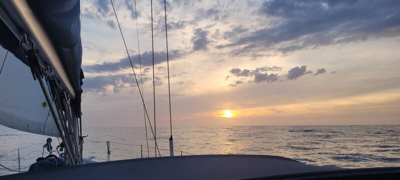 Om zes uur gaat de wekker opnieuw en neemt Renata het stokje weer over van Paul Michèl. De zonsopkomst is bezig. Door de wolken duurt het even voordat de zon te zien is. We varen inmiddels boven Terschelling. We zitten in dubio wat we zullen doen. Naar IJmuiden volgens oorspronkelijk plan of toch bij Vlieland naar binnen. De wind ziet er niet heel fijn uit om de hoek te maken naar IJmuiden. We kijken het nog even aan totdat Renata op het punt zal komen waar de keuze definitief gemaakt moet worden.