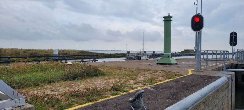 Vanuit de verte zien we al veel masten liggen in de kom voor de brug bij Kornwerderzand. Als we de kom binnenvaren liggen de boten al gestapeld aan de wachtsteigers en er draaien ook een aantal boten rondjes. We horen dat we moeten wachten tot de de beroepsvaart is geschut, voordat wij aan de beurt zijn, dus dat kan nog wel even duren. Na een tijdje is de Fransman die als eerste aan de wachtsteiger ligt het wachten zat en wil losknopen. Dat lijkt ons geen strak plan. We mogen nog niet schutten en als wij losknopen, dan knoopt iedereen los - iets met kuddegedrag en schaapjes en een dam - dus dat gaan we niet doen.