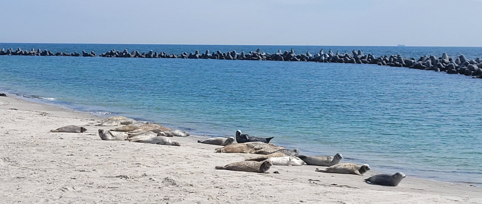 We slaan meteen linksaf naar het strand om kloksgewijs een rondje over het eiland te lopen. Hier zijn meestal de robben te vinden, maar nu helaas niet. Er zwemmen wel wat robben of zeehonden aan het begin, maar er liggen er geen op het strand. Ondanks dat is het een mooi strandje waar enkele mensen liggen te zonnen of zwemmen. Bij de zuidoosthoek van het eiland ligt achter een afschermingslint een groep zeehonden die aan het vervellen zijn en daarom rust en warmte hier zoeken. Ze liggen mooi op een kluitje. Af en toe schuiven ze op naar het water.