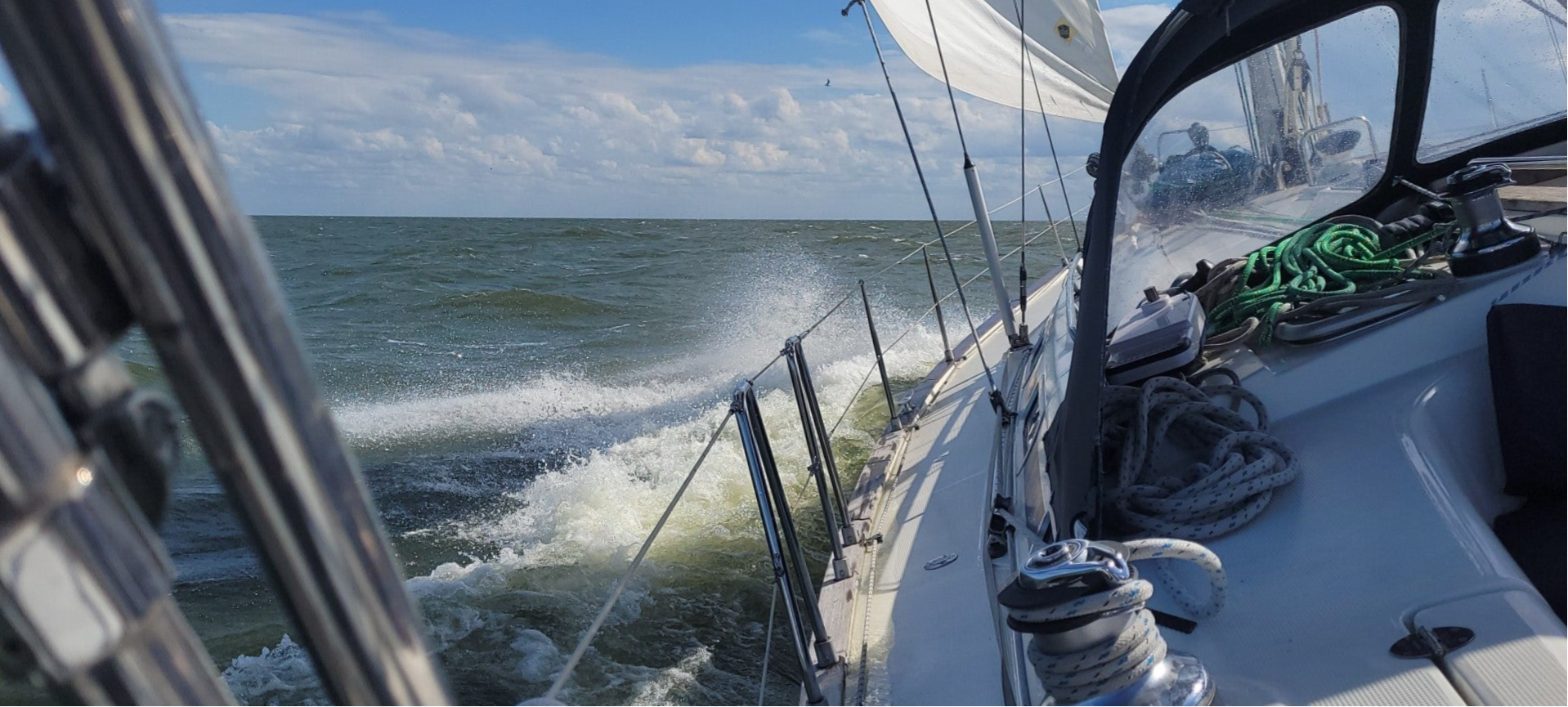 Bij de Reede draait de koers naar Helgoland en dat is minder fijn. De snelheid gaat er wat uit en het geklots neemt toe. Een tijdje varen we met zo'n 5,5 Kts. Voor Judith een hele vervelende koers, dus we besluiten de motor bij te zetten.