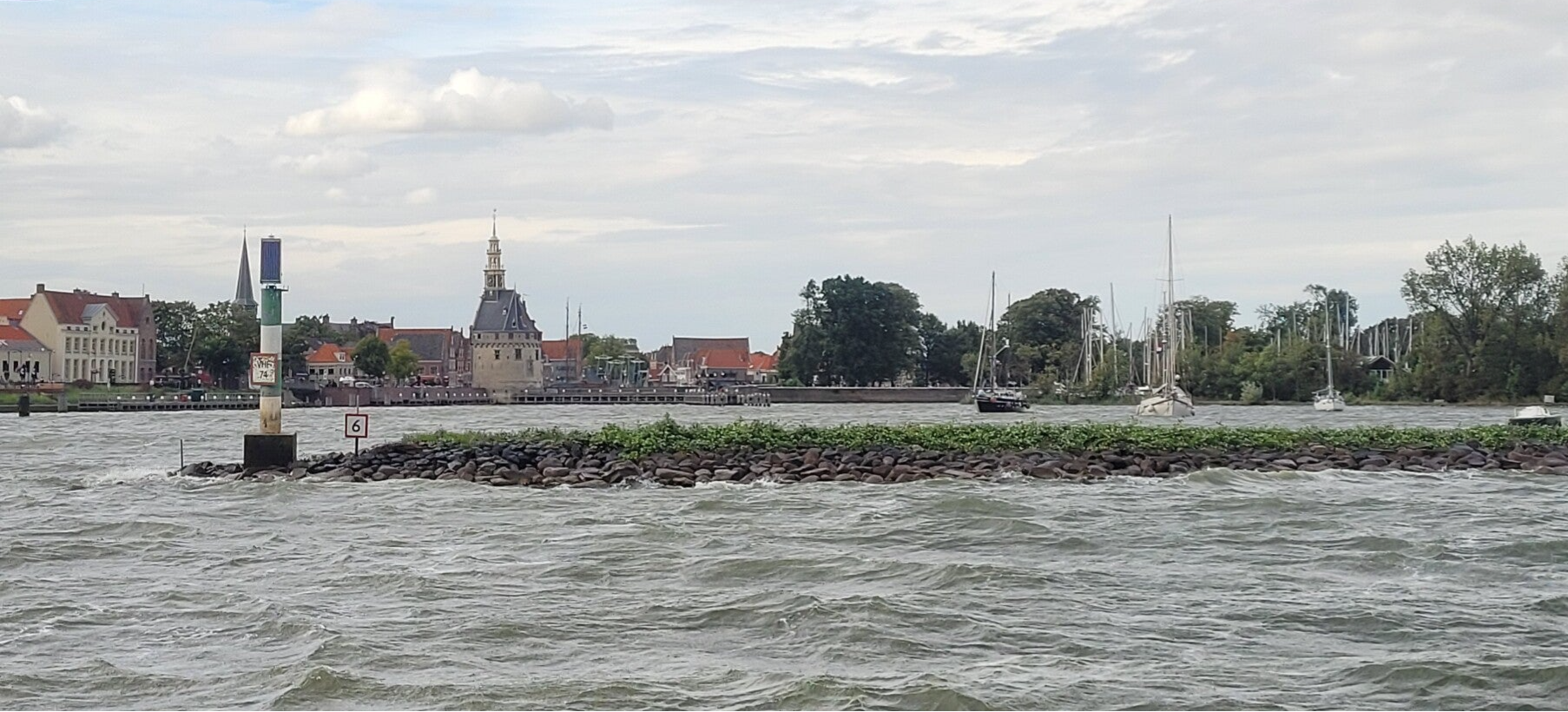 Na de sluis is het al gauw gedaan met fijn zeilen. Het wordt grauwer en grauwer en recht tegen de wind in. We gaan niet sneller meer dan zo'n 5,5 Kts, waardoor we nog zeker 3,5 uur aan het stampen zouden zijn op de motor of nog langer opkruisend in de wind. Er dreigt ook onweer in de verte. De lucht wordt zwarter, het water grauwer groen. Paul Michèl stelt voor om uit te wijken naar Hoorn. Dit is meteen prettiger varen, omdat het beter bezeild is.