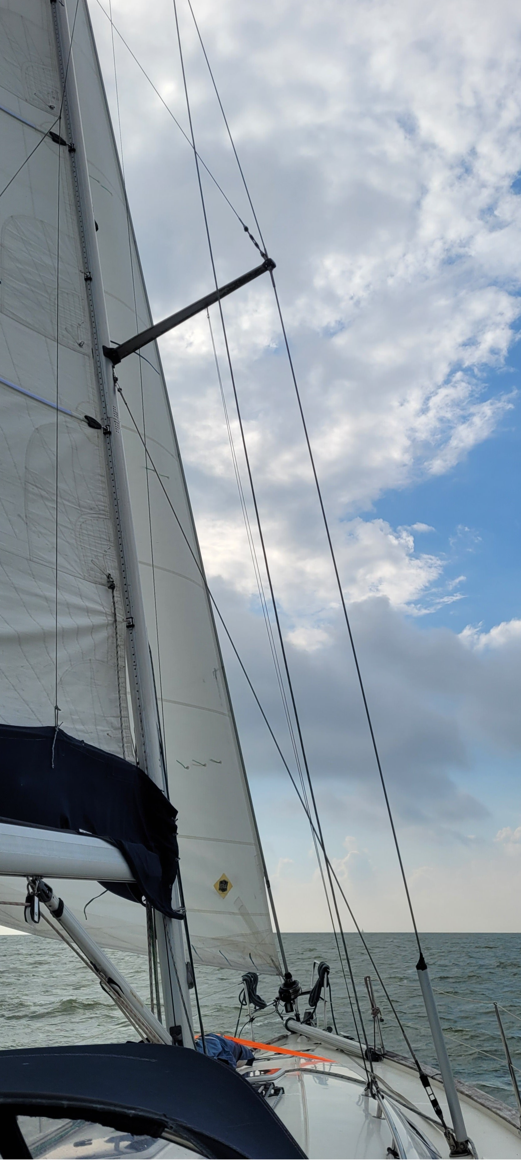 In de voorhaven doen we het grootzeil alvast omhoog, zodat we dat rustig buiten de deining van de zee kunnen doen. Dat gaat perfect en we zeilen zo met halve wind de haven uit. Het gaat als een speer richting het scheidingsstelsel ter hoogte van de Jade 1-boei. Dan moeten we steeds meer bij gaan draaien richting het westen en de wind neemt steeds meer af. De motor moet dus bijdraaien. Vlak na het scheidingsstelsel, maakt Paul Michèl de pasta warm en hebben we een lekker maaltje. Als toetje eten we lekker de zelfgemaakte appelmoes.