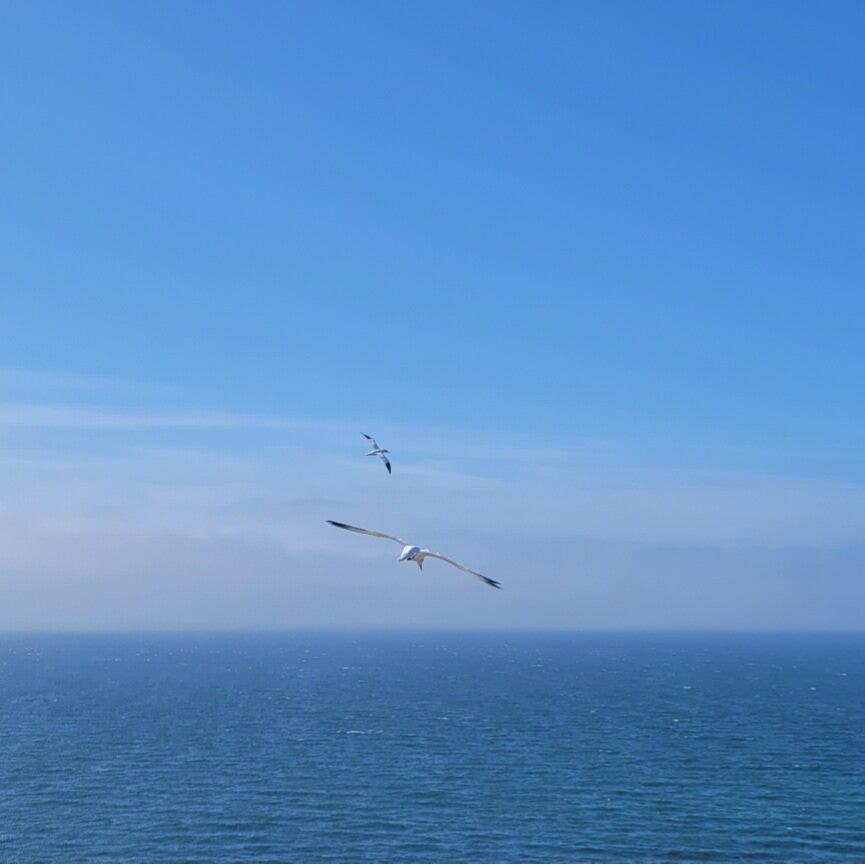 Als de meiden terug zijn van het hardlopen, gaan we ontbijten, gaat Paul Michèl de pasta klaarmaken en dan gaan de wandelschoenen aan. Op pad om Jan-van-Genten te gaan kijken aan de andere kant op de kliffen van het eiland. Het is aardig zonnig al is er nog wel wat zeemist. Ook de kinderen vinden het zeer spectaculair om deze vogels van zo dichtbij te aanschouwen. Ze zijn er niet weg te slaan.