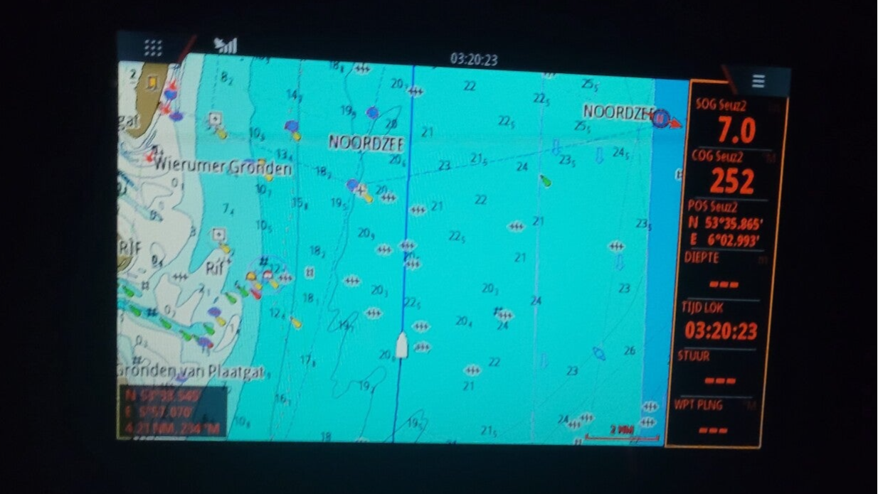 Om 1.00 uur gaat de wekker van Renata. Weer aankleden en naar buiten. Paul Michèl en Judith zijn in de kuip. Na de overdracht gaat Paul Michèl slapen. Renata en Judith houden samen de wacht tot Maxim er ook bij komt. We varen rustig van ton naar ton boven de waddenkust. We kunnen nog steeds een beetje zeilen. Het fok is uitgerold. Na een uurtje vertrekt Judith en later ook Maxim weer naar bed. Omdat het zo donker is, is het vooral varen op plotter en AIS. Met de AIS houden we in de gaten waar welke schepen varen, welke kant ze op varen, hoe groot ze zijn en hoe snel ze gaan. Sommige schepen verdwijnen af en toe van de AIS om later weer terug te komen. Zo verschijnt er ook plotseling een boot aan stuurboordzijde op de AIS. Renata ziet een rode lamp en witte lampen, dus dat zou de verlichting van deze boot kunnen zijn. De boot lijkt echter steeds maar langer en langer te worden, tot het niet meer realistisch lijkt. Waarschijnlijk hoort de witte verlichting niet bij de rode lamp die de bakboordzijde van het schip aangeeft. Het verwijdert zich echter steeds meer van ons, dus ze gelooft het verder wel.