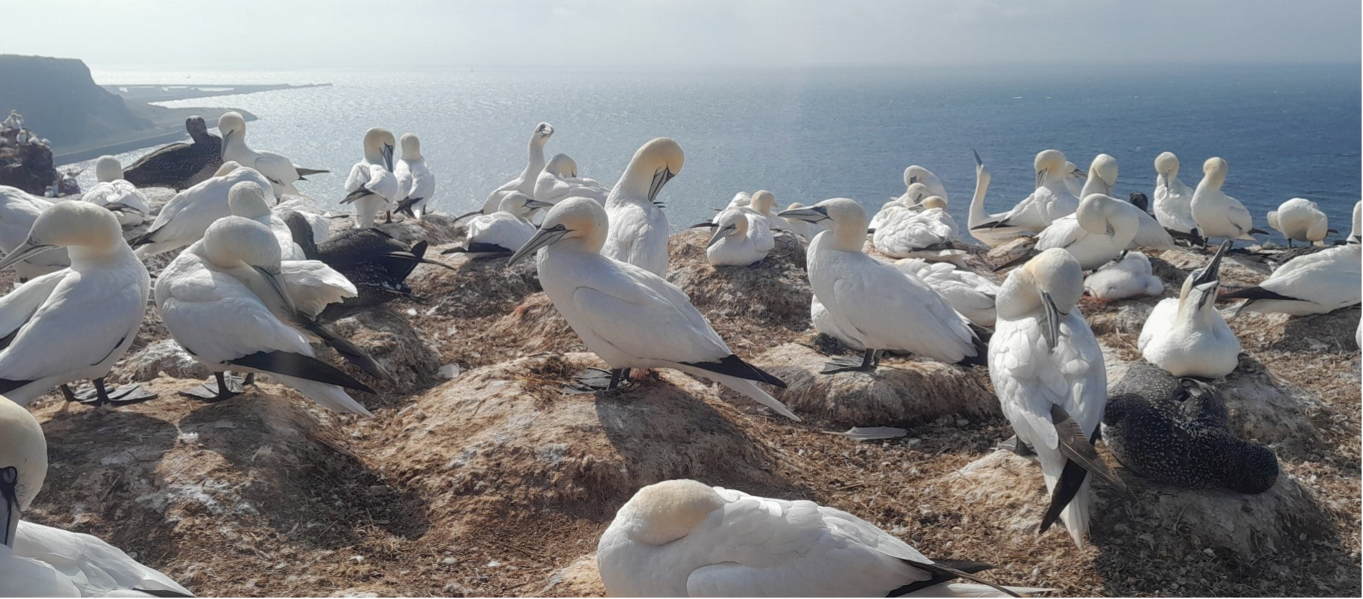 We spotten zelfs nog een echt wit fluffy Jan-van-Gent-kuiken. En dat niet alleen, we spotten ook Arjen en Ilse hier weer, die ook nog een keer vogeltjes komen kijken. Wij lopen verder naar de Lange Anna. Een paar weken geleden konden we haar niet eens zien liggen door de dichte mist.